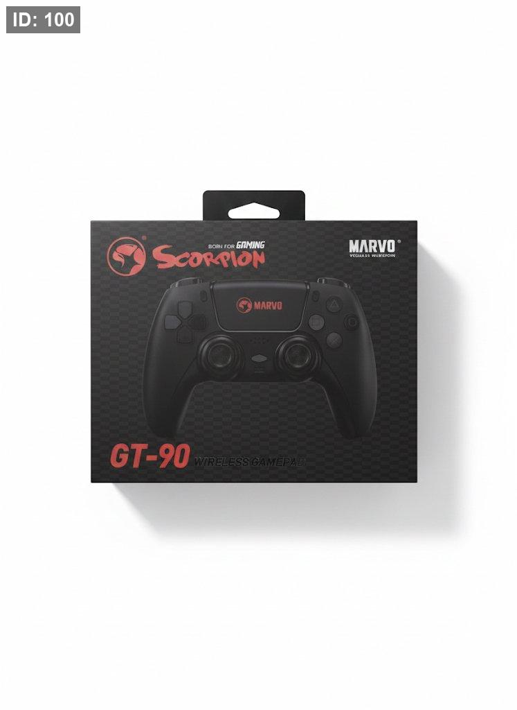 Marvo Scorpion GT‑90 هو يد تحكم (جويستيك) للألعاب من مارفو، يدعم البلوتوث (إصدار 4.2) مع مدى يصل إلى حوالي 10 أمتار، ويعمل على أجهزة مثل PS4، الكمبيوتر، والهواتف. يحتوي على 20 زرًا، بالإضافة إلى محركي اهتزاز ثنائي لإحساس واقعي أثناء اللعب. مزوّد بمستشعر حركة من 6 محاور (جيروسكوب + مقياس تسارع)، كما يوجد لوحة لمسية (Touch Panel) للتحكم الإضافي. البطارية داخليّة بسعة 600 mAh قابلة للشحن عبر USB، ويوجد منفذ 3.5 مم لسماعة أو مايكروفون.