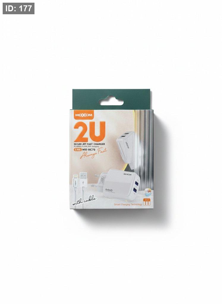 شاحن موكسوم MX-HC70 يأتي بمنفذين USB يدعمان الشحن السريع والأمان من خلال تقنية AUTO-ID لتحديد التيار المناسب للجهاز المتصل. تبلغ قوة الشحن القصوى 12 واط (2.4 أمبير) لتوفير شحن فعال وسريع. يحتوي الشاحن داخل العلبة على كابل موكسوم عالي الجودة بطول 1 متر من نوع Micro-USB. يتميز بتصميم أنيق ومتين باللون الأبيض، مما يجعله مناسبًا لمختلف الأذواق. كما أنه متوافق مع معظم الهواتف الذكية والأجهزة اللوحية من علامات مثل Apple وSamsung وXiaomi وHuawei وOPPO وغيرها.