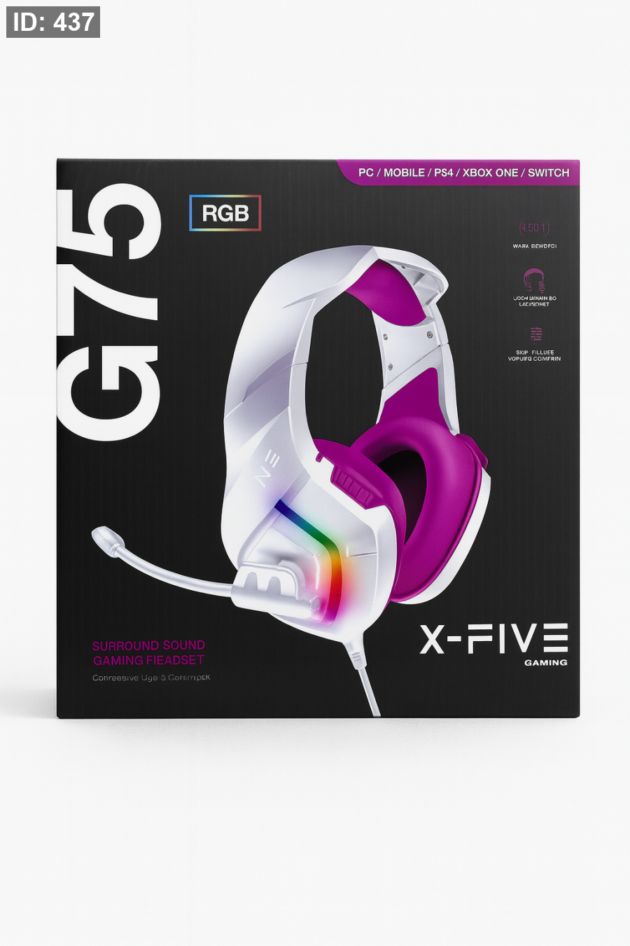 سماعة X-FIVE G75 هي سماعة مخصّصة للاعبين توفر صوتًا غامراً وجودة عالية لتجربة الألعاب، الدردشة، ومشاهدة المحتوى. تتميز بتصميم مريح مع وسائد أذن ناعمة، ميكروفون واضح، وإضاءة RGB جذابة، وتوافق مع عدة أجهزة عبر كابل USB أو منفذ 3.5 مم.