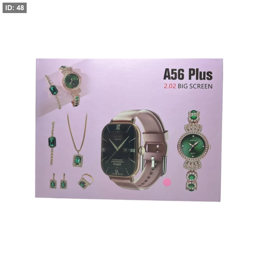ساعة ذكية A56 Plus بشاشة ملونة كبيرة، تتابع الصحة (نبض القلب، الأكسجين، ضغط الدم) والنشاط البدني، تدعم إشعارات المكالمات والرسائل، مقاومة للماء، بطارية تدوم عدة أيام (حوالي 200 mAh)، تصميم أنيق وخفيف، ومتوافقة مع أجهزة Android وiOS.