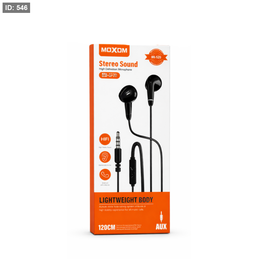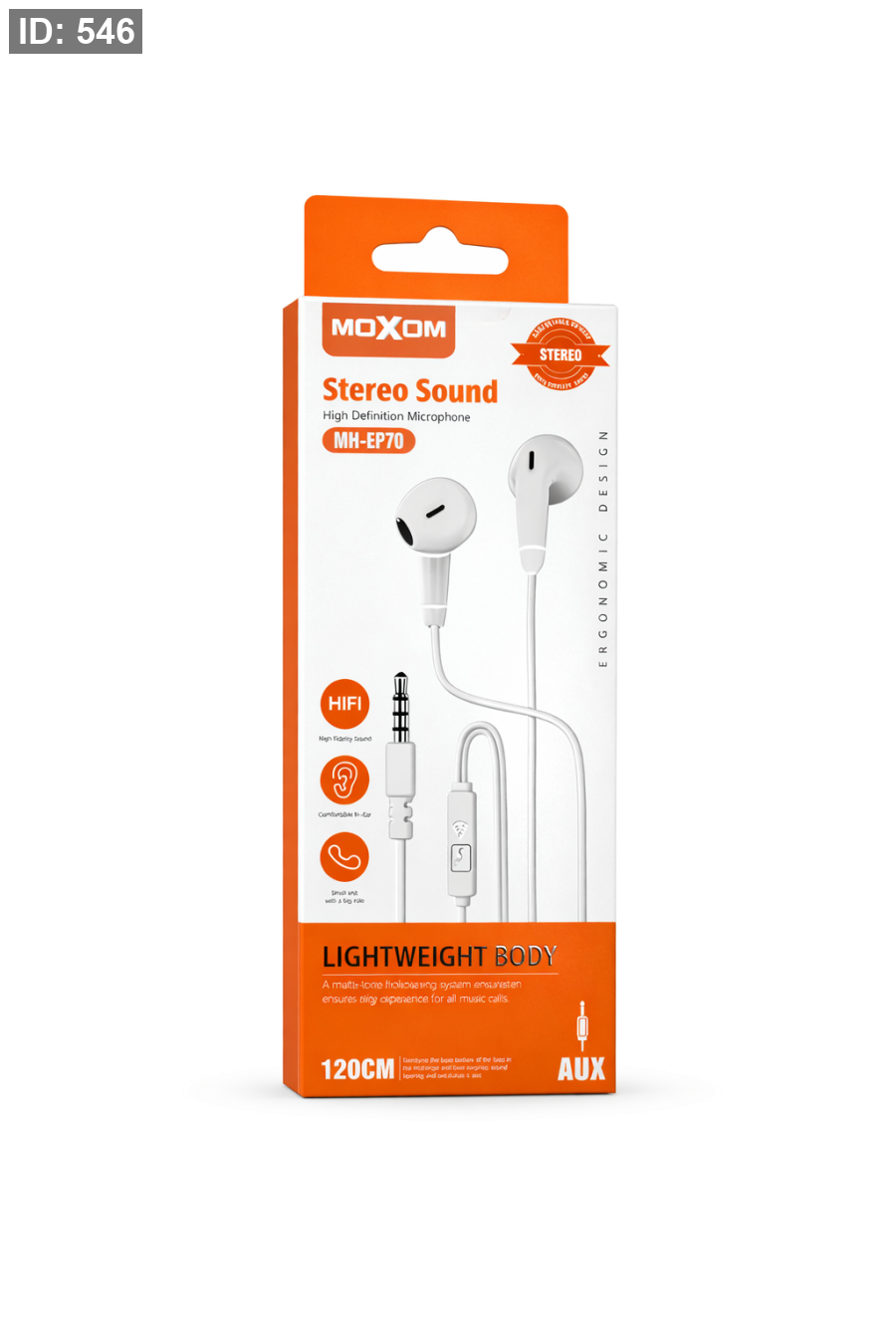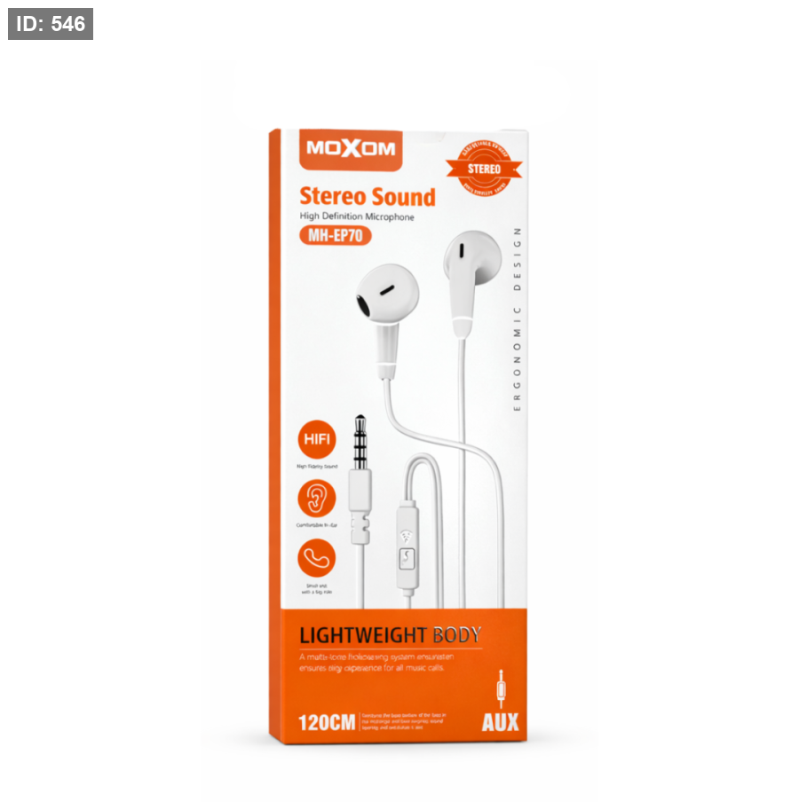 سماعات MOXOM MH-EP70 توفر صوت ستيريو واضح بجودة عالية مع مايكروفون مدمج للمكالمات. تصميمها خفيف ومريح للاستخدام اليومي، ومناسب لساعات طويلة بدون إزعاج. تأتي بسلك بطول 120 سم ومنفذ AUX 3.5mm لتعمل مع الهواتف، الأجهزة اللوحية، اللابتوبات، والريسيفرات. خيار عملي للاستماع للموسيقى وإجراء المكالمات بجودة ممتازة وسعر مناسب.