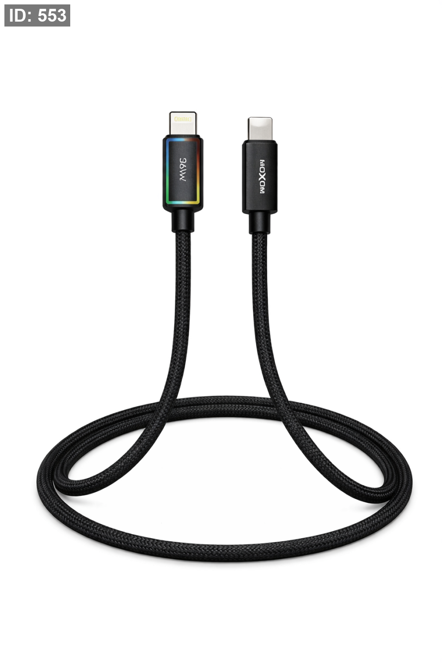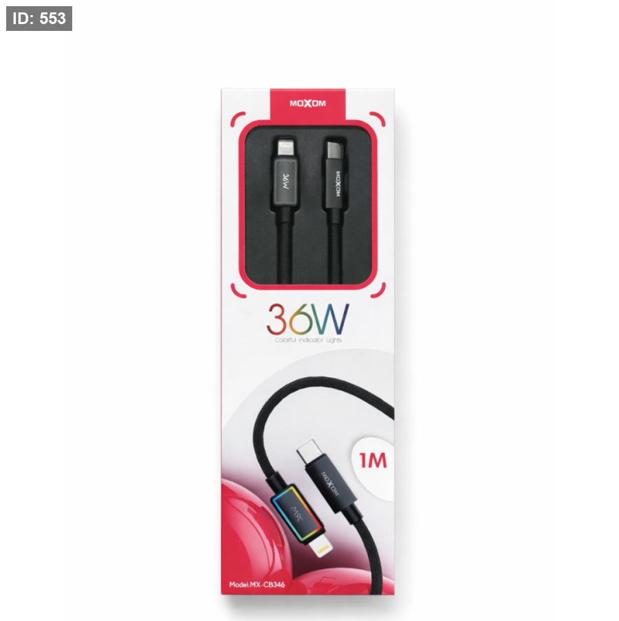 كيبل شحن عالي الجودة من MOXOM مصمم ليعطيك شحن سريع وآمن لأجهزة الآيفون. يتميز بتصميم متين مع تغليف نايلون مضفور لزيادة التحمل ومنع الانقطاع، بالإضافة إلى مؤشر ضوئي ملوّن يوضح حالة الشحن.