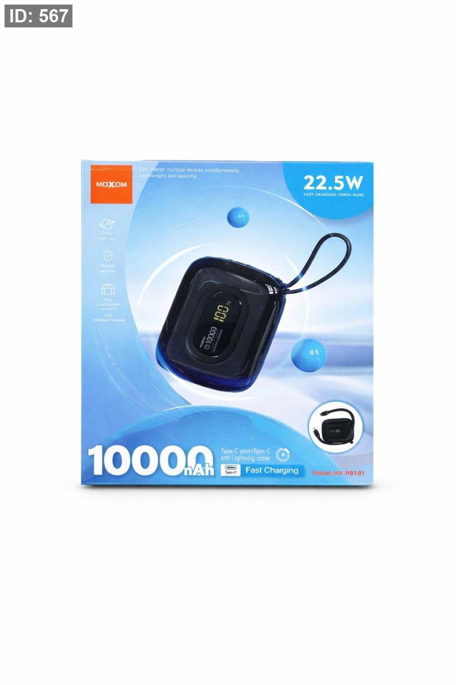 باور بانك صغير وأنيق من Moxom بسعة 10000mAh يدعم الشحن السريع حتى 22.5W. يأتي مع شاشة LCD لعرض نسبة البطارية وكابل مدمج لسهولة الاستخدام في أي وقت.