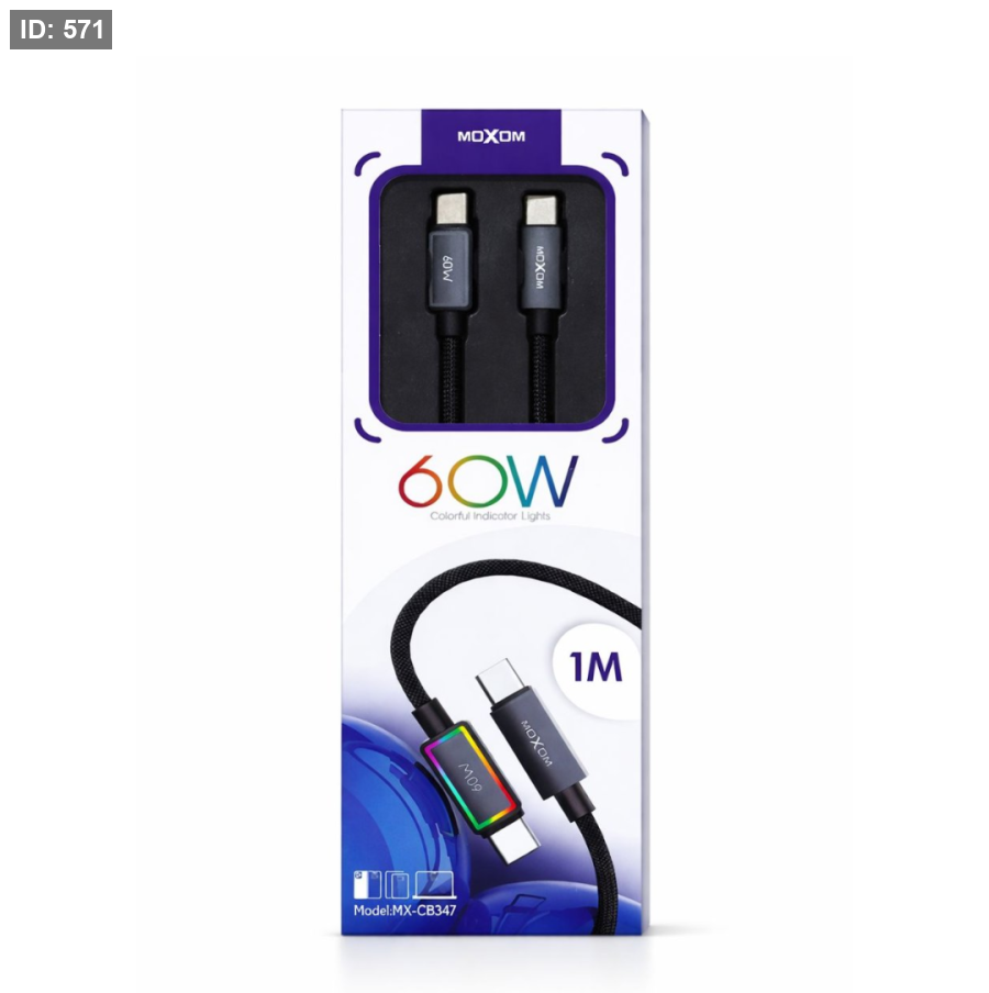 كيبل شحن سريع من Moxom يدعم قدرة تصل إلى 60W، مصمم لشحن الأجهزة بسرعة عالية مع إضاءة مؤشر ملونة. يتميز بكابل قوي ومتين مناسب للاستخدام اليومي.