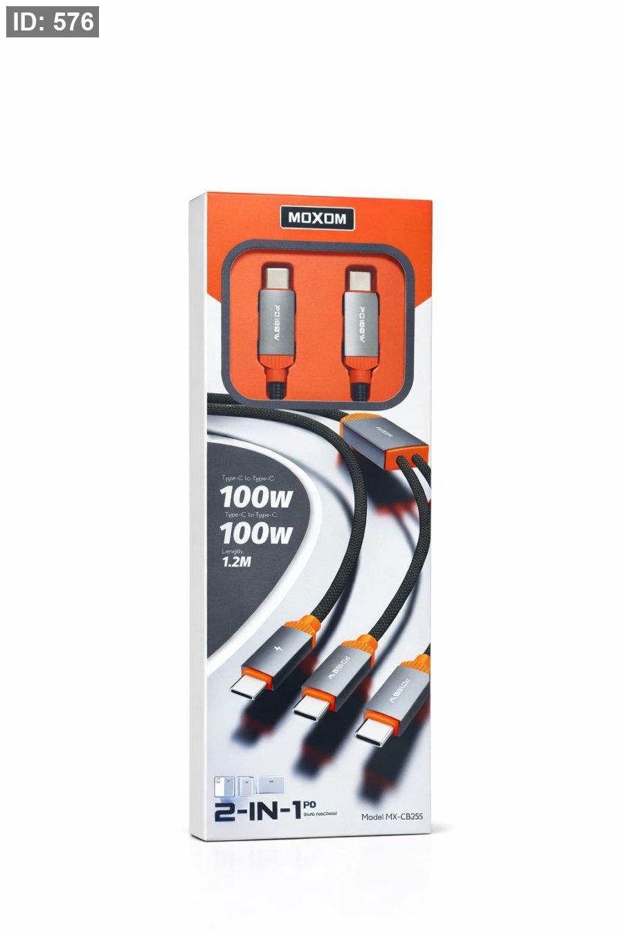 كيبل شحن سريع متعدد الاستخدام من Moxom بقدرة تصل إلى 100 واط، مصمم لشحن عدة أجهزة بكابل واحد بفضل تصميم 2-in-1 العملي، مع دعم الشحن السريع للأجهزة الحديثة.