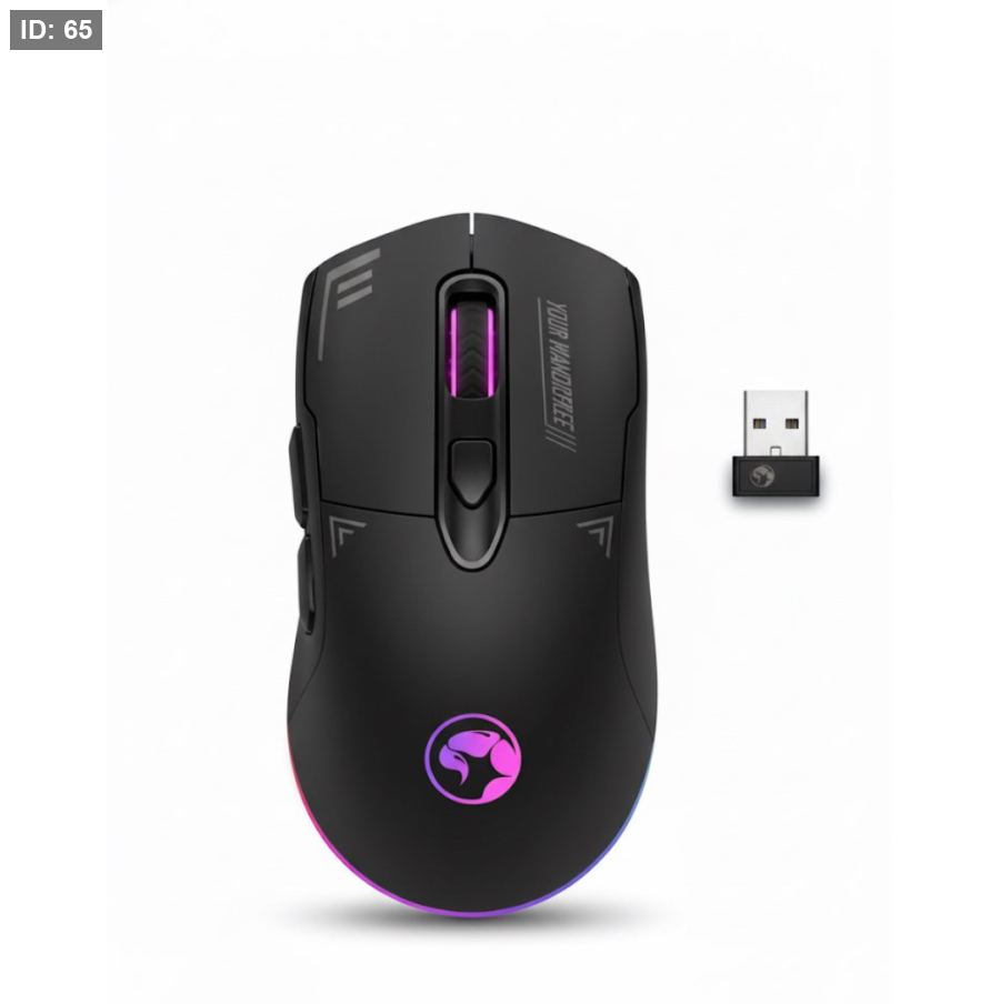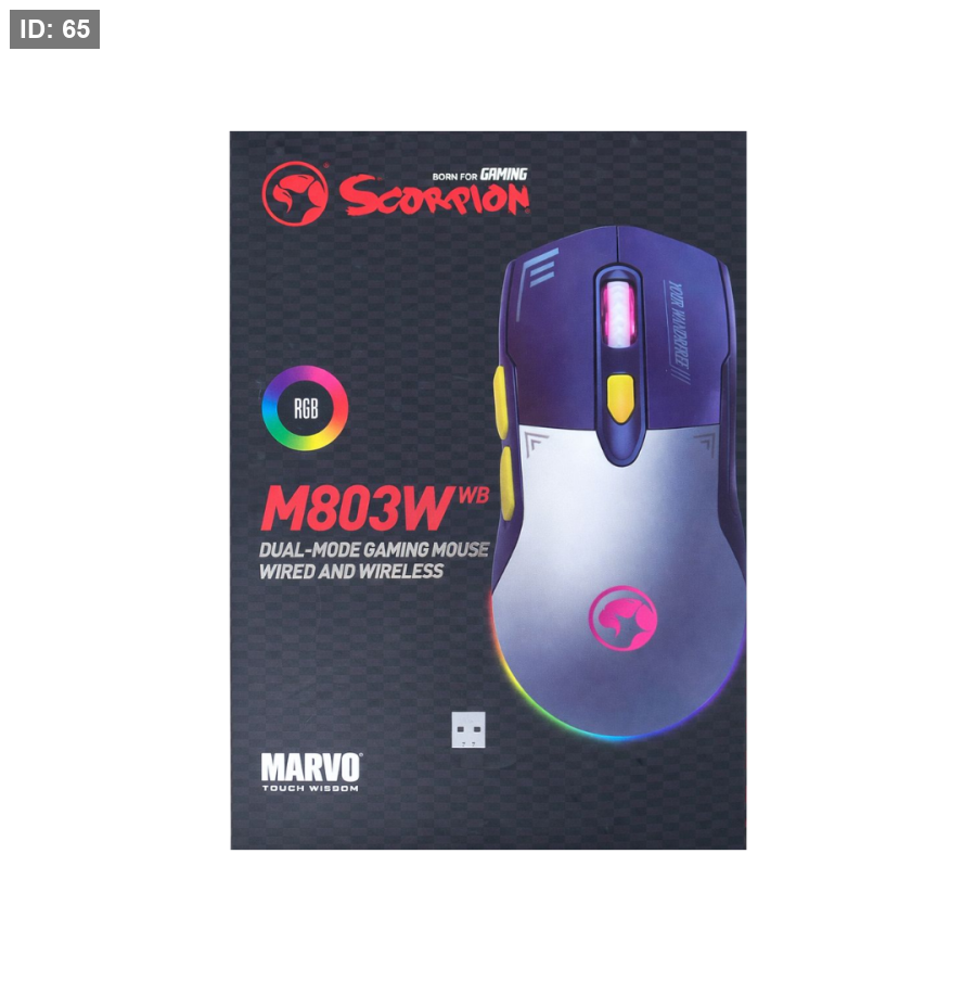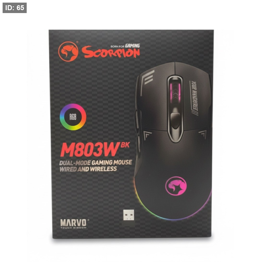 ماوس ألعاب من Marvo (موديل M803W) يدعم الاتصال المزدوج (سلكي + لاسلكي 2.4 GHz) بشريحة PAW3212، ودقة DPI قابلة للتعديل (800‑4800)، بطارية 500 mAh قابلة للشحن، مع 7 أزرار، إضاءة RGB متعددة الأوضاع، وتبديل سلاسة بين وضع الشحن والاستخدام اللاسلكي.