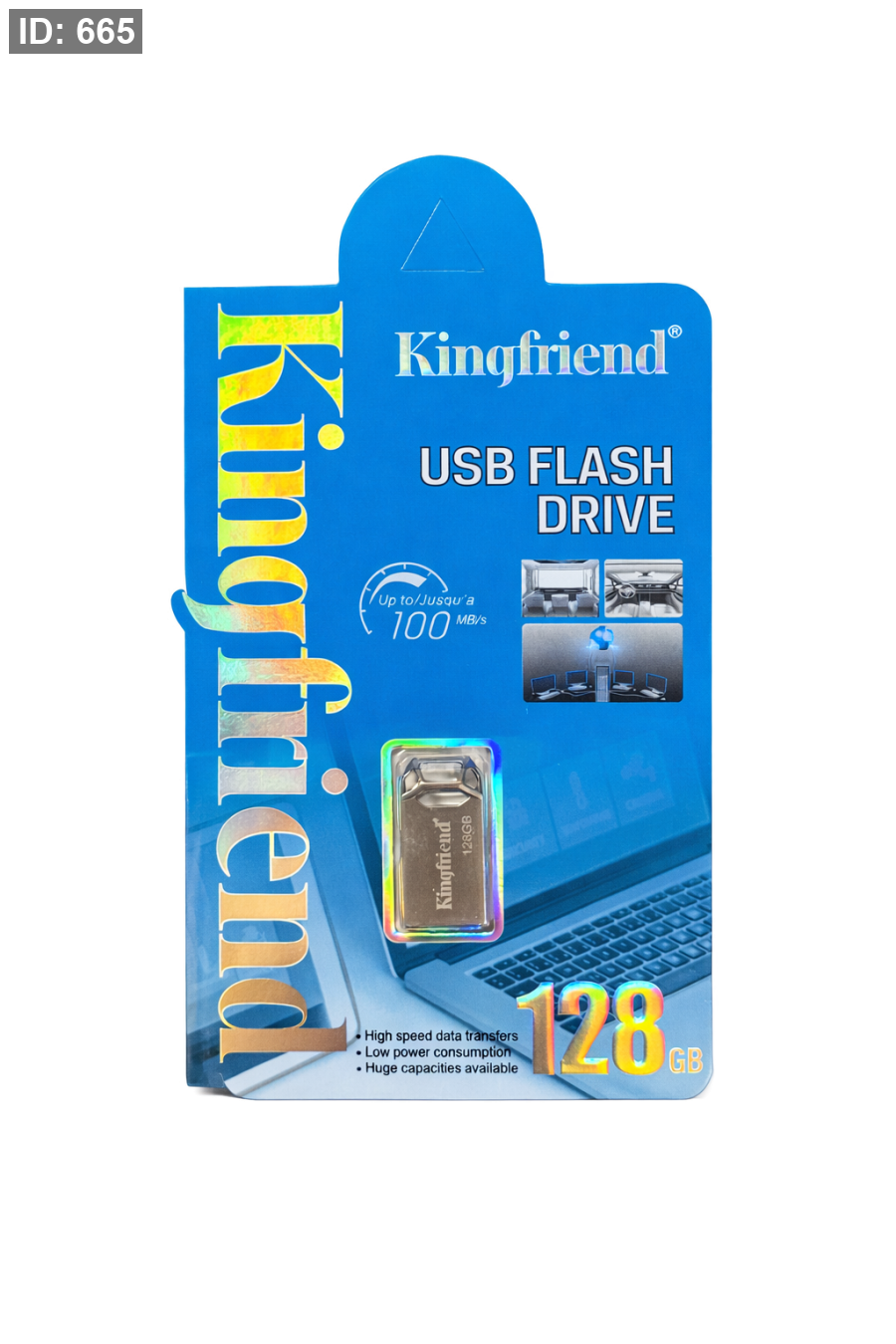 فلاش ميموري Kingfriend بسعة 128 جيجابايت لتخزين ونقل الملفات بسهولة بين الأجهزة مثل الكمبيوتر، اللابتوب، والتلفاز. يوفر سرعة نقل جيدة وتصميم معدني صغير سهل الحمل.
