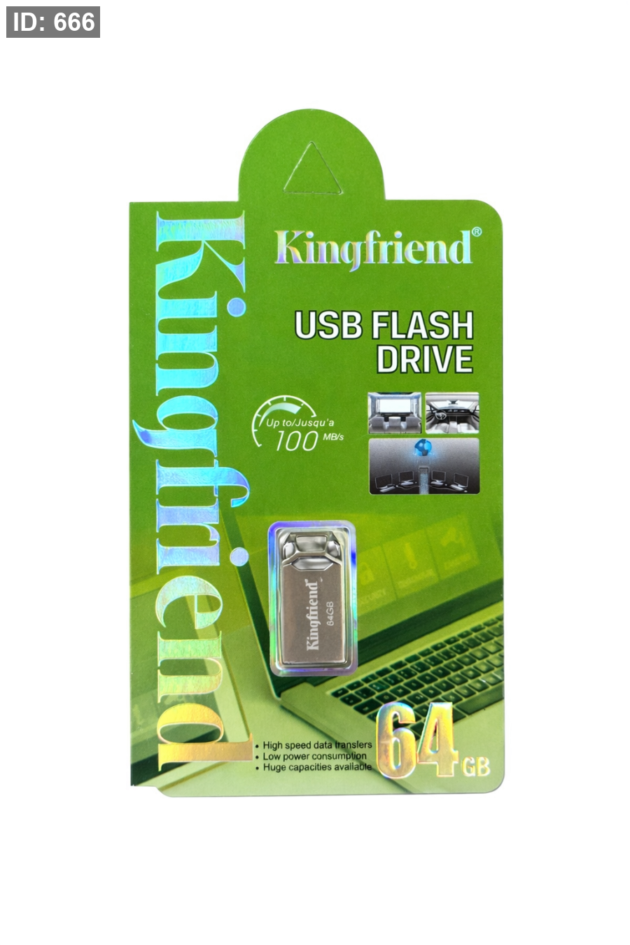 فلاش ميموري Kingfriend بسعة 64 جيجابايت مناسب لتخزين ونقل الملفات بسرعة وسهولة بين الأجهزة مثل الكمبيوتر، اللابتوب، والتلفاز. يتميز بتصميم معدني صغير وسرعة نقل بيانات جيدة.