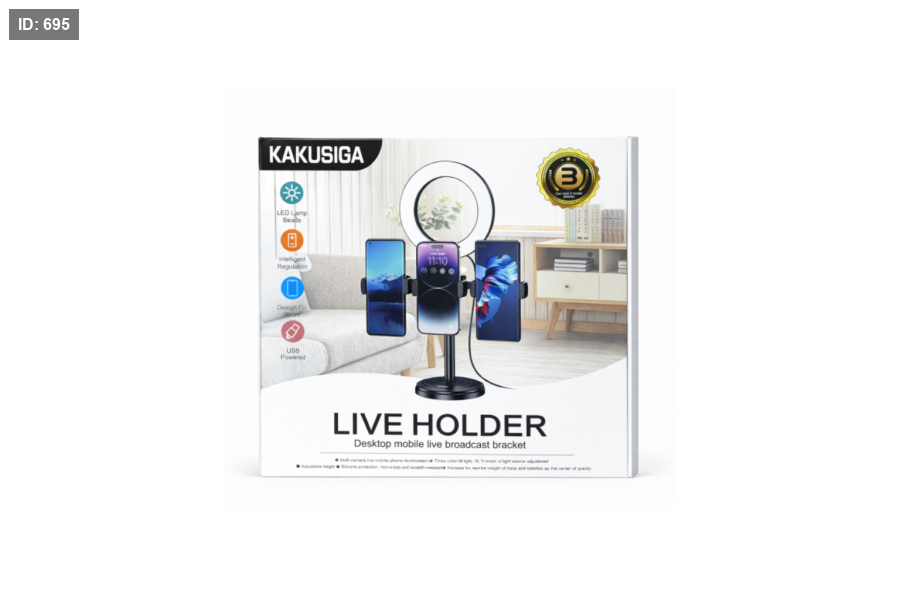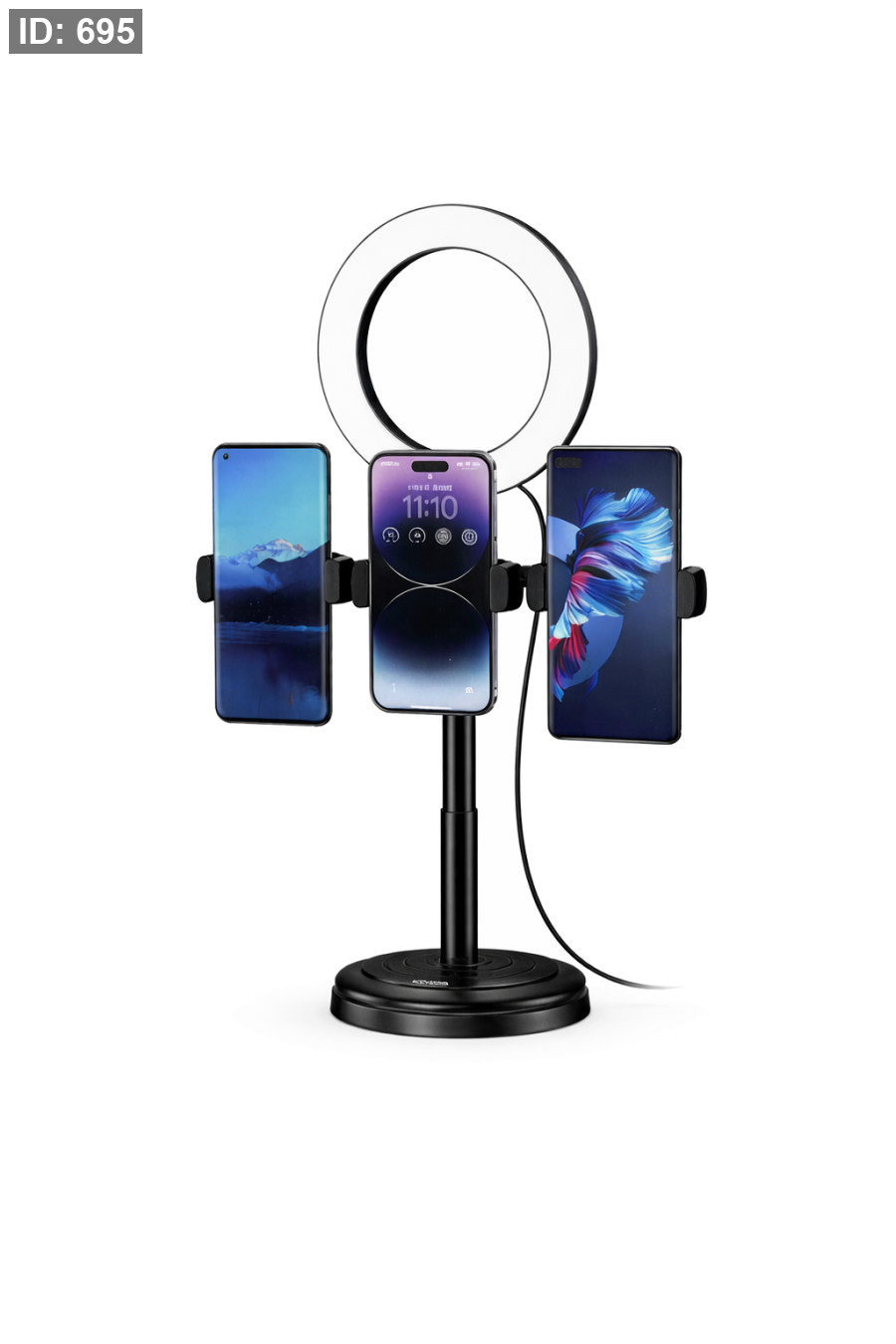 حامل تصوير احترافي مع Ring Light LED مخصص للبث المباشر وصناعة المحتوى. يدعم تركيب 3 هواتف في نفس الوقت مما يجعله مناسب للتصوير على أكثر من منصة مثل TikTok وInstagram وYouTube.