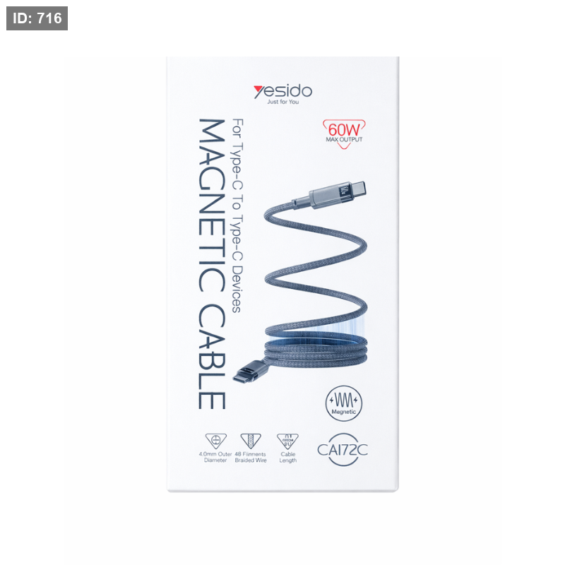 كابل شحن مغناطيسي قوي يدعم Type-C إلى Type-C مع قدرة شحن تصل إلى 60W، مناسب للهواتف الذكية والأجهزة اللوحية واللابتوبات التي تعمل بمنفذ USB-C. يتميز بتصميم مغناطيسي يلتف بسهولة لسهولة التخزين والتنظيم.