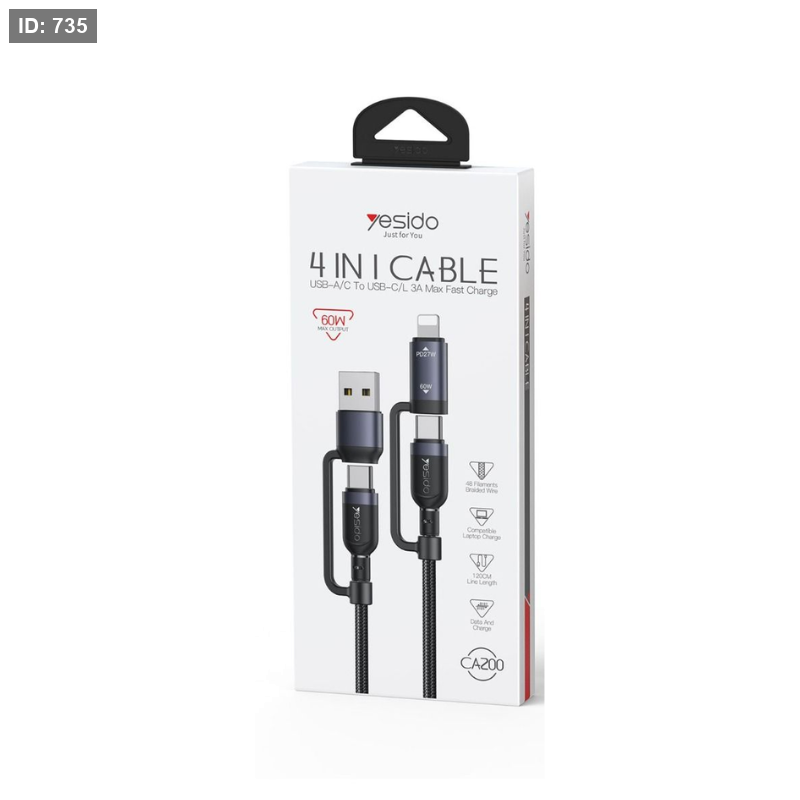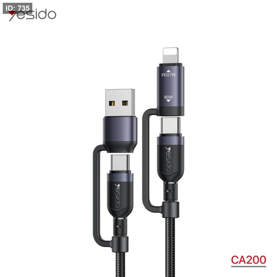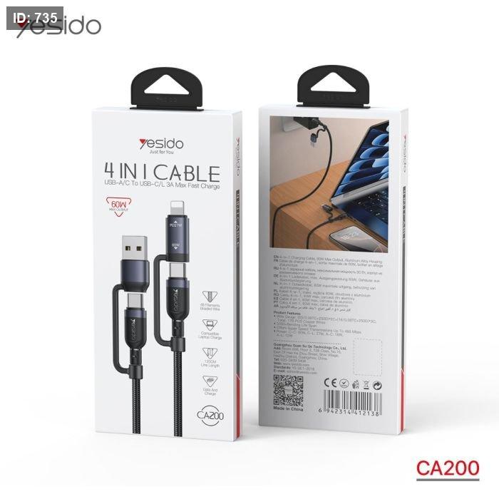 كابل متعدد الاستخدامات من Yesido بتصميم 4 في 1 يتيح شحن مجموعة واسعة من الأجهزة باستخدام منافذ USB-A و USB-C إلى Lightning و Type-C. يدعم الشحن السريع حتى 60W مع تصميم مضفر قوي مناسب للاستخدام اليومي.